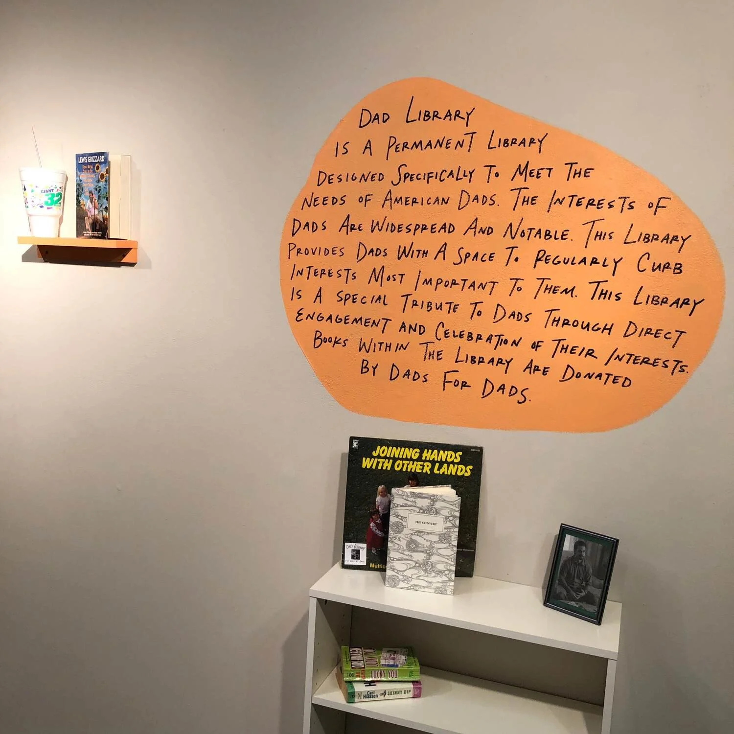 Dad Library is a library designed specifically for Dads, by Dads. Fathers by any definition throughout the country were invited to contribute any books, media, or periodicals they wish to see in a library. Books within this library are contributed from a variety of locations including San Francisco, New York, Portland, and Chicago. Through the collection of books and other media, fathers are celebrated and defined beyond their stereotypical boundaries, and are brought together to share one space despite differing interests, opinions, or physical boundaries. This space explores what it means to be a dad of any kind, and invites all dads to come together and share in their “dad-ness.” This space also becomes a sentimental environment for those that may have fathers that have passed, are estranged, or are separated by distance. Visitors are welcome to browse and continue to contribute books throughout the duration of the exhibition however, books must have some kind of connection to a Dad.